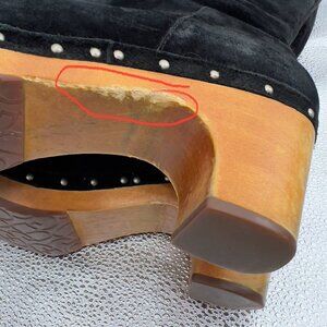 Condition: Pre-owned. Signs of wear include scuffs and discoloration on wood heel (see photos), wear to front toe area, and slight marks on suede. Still very wearable with plenty of life left.