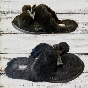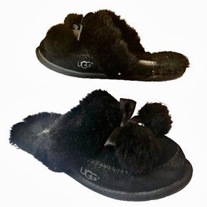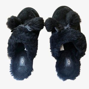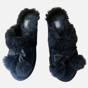 UGG Australia suede sheepskin scuffs/slippers. Fixed satin bow and sheepskin pom poms. Rubber outsole. Style name 'Hafnir'.