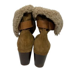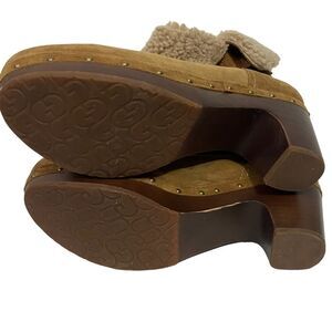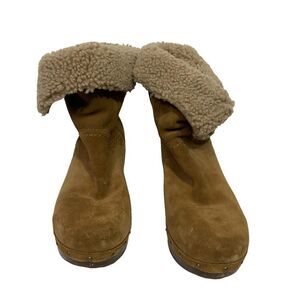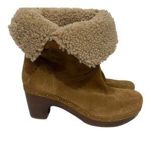 Gently worn women's size 9 UGG Australia Tan Shearling Lined Heeled Leather Boots. Fold over top, studded details, please review all photos for any/all signs of wear-pictured. Comes from a smoke free home, bundle with other items to save and minimize shipping cost.