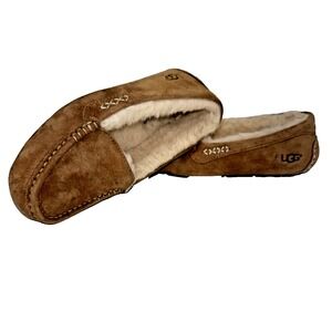 Preowned in good condition with some dirt in the inside of the shoe on the inside and some scuffing and discoloration on the outside at the heels. Women's UGG Australia Ansley Chestnut Suede Moccasin Slippers Sheepskin in US size 7. See photographs for measurements to ensure proper fit. Ships out quickly!