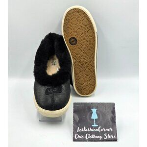 These UGG slippers are a cozy indulgence, featuring plush black fur lining and a durable exterior. Their refined design ensures both comfort and style for lounging or quick outdoor errands. Perfectly crafted to keep feet warm, they boast a luxurious feel and premium material construction, embodying relaxation at its finest.