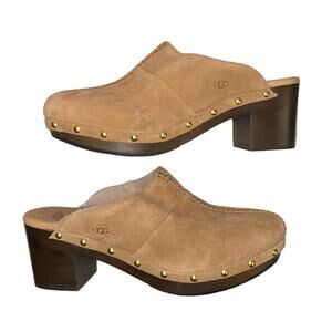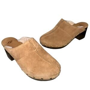 UGG Australia Women's Kassi Tan Shearling Fur Block Heel Platform Wood Clogs 9