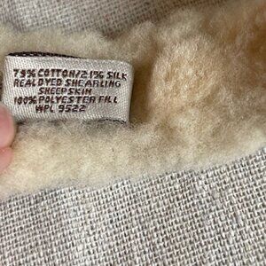 100% Shearling with embroidered logo fabric 79% cotton/21% Silk, fill is 100% poly ; made in china