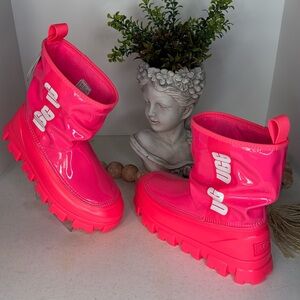 A contemporary rendition of UGG's Classic Mini boots, the Brellah is characterised by its glossy water-repellent upper, seen in a flamingo pink colourway with the brand's logo printed on the side in contrasting white. pink