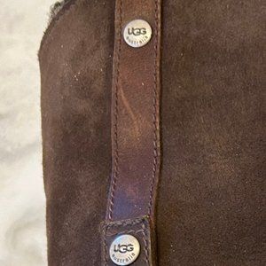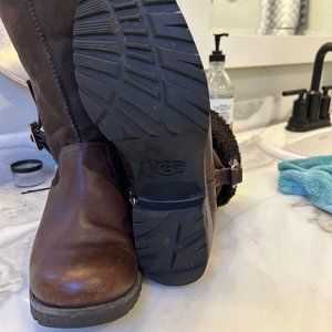UGG, BROWN LEATHER & LAMBS WOOL SUEDE BOOTS SIZE 8, IN GREAT CONDITION, BEAUTIFUL LEATHER & LAMBS WOOL, YOU CAN FOLD IT DOWN FOR A SHORTER BOOT WITH WOOL SHOWING. OR WEAR ALL THE WAY UP. I PAID $300. IF YOU LIKE THESE I DO HAVE THE BLACK FULL ON LEATHER NO DOWN.