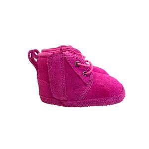 UGG Baby Boots Rock Rose Suede. Sherpa lined. Hook & Loop and fixed elastics. Features Ugg logo on heel and on molded rubber outsole. Size 2/3 New. Slight discoloration noted on bottom heels. See pic.