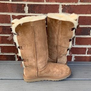 Silky bows decorate these tall Chestnut suede boots by UGG! Features an applied water repellency treatment, twin face sheepskin upper, fixed satin bows along back, sheepskin lining and insole, Treadlite by UGG soles and an approximate 12" shaft height. Excellent condition, with minimal marks/dirt throughout, very light matting to insoles and very minor wear/dirt to soles, as pictured. Chestnut, with brown satin bows. Size 7. Firm price!!