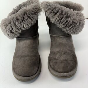 Description: UGG Bailey Button kids girls size 5 boots in gray featuring signature button closure and plush sheepskin lining. Style 5991Y with classic UGG construction including suede upper and foam cushioned insole. The cozy sheepskin collar provides warmth while the button detail adds style to these winter boots.