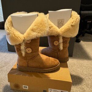 UGG Bailey Button Triplet Chestnut Suede Sheepskin Women’s Boots Size 7 w/Box