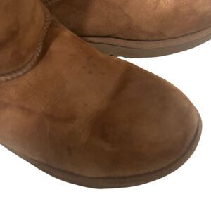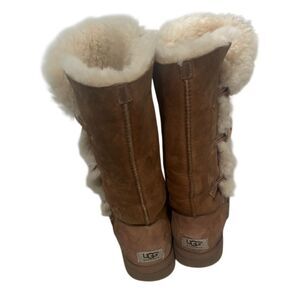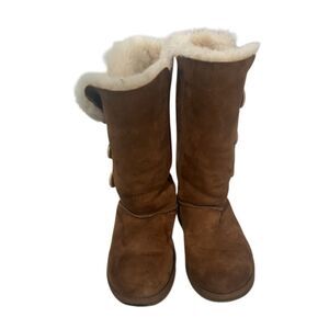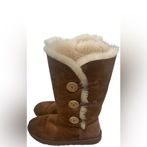 These are preowned chestnut brown boot by Ugg. The Ugg Women's Bailey Button Triplet Boots are a tall boot with three wooden buttons and a soft, cozy lining made from genuine shearling. They have a plush footbed to keep feet warm and comfortable. The boots have button-and-loop closures and are made with a twinface sheepskin upper and a genuine shearling and wool lining. They have some spots on the suede upper in the field area please see detailed images.