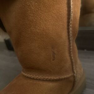 Warm tan suede boots featuring a plush shearling lining. Perfect for cold weather.