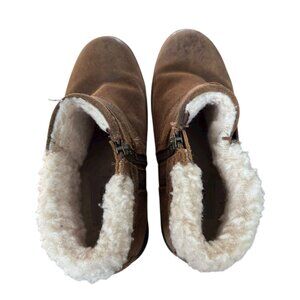 Women's UGG Benson II waterproof ankle boot in brown leather, buckle strap, a medial zipper, and curly UGGpure wool collar and insole. 1.5" block heel. Made in Vietnam. Great condition, and I can't tell if the color changing as you can see on the toe is the character of the boots or wear. They look cool in person! Please feel free to ask me questions. Smoke free pet free home. Quick shipper!