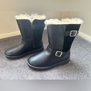 Stylish UGG ankle boots. Black exterior with cream fur lining. Features buckle and zipper details. BRAND NEW