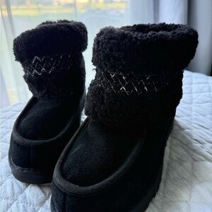 Cozy black ankle boots with soft shearling lining. Ideal for winter wear.
