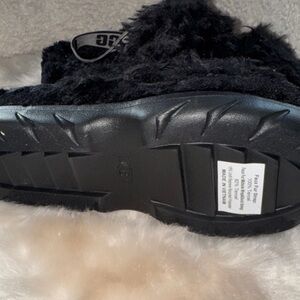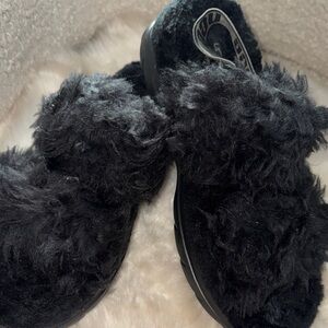 Cozy black fluffy sandals. UGG branding on strap. Perfect for comfort and style.