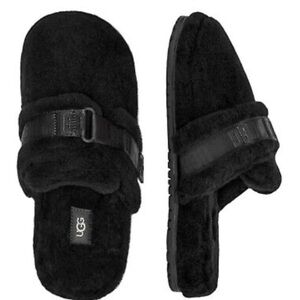 UGG Black Fuzzy Wool Closed Round Toe Logo Print Strap Slippers NWOB