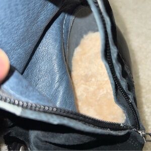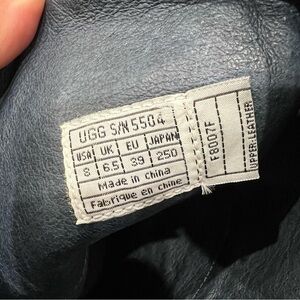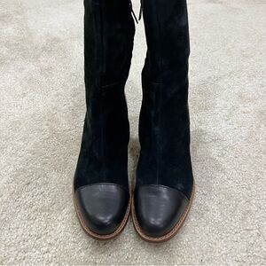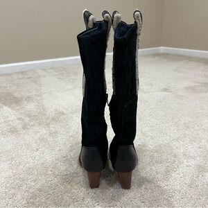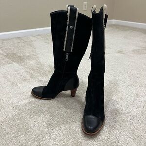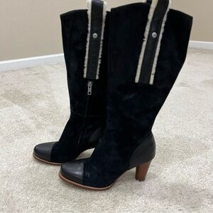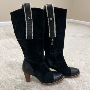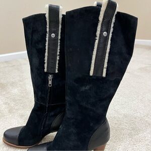 Stylish UGG heeled boots. Black suede with cream accents. Perfect for any occasion.