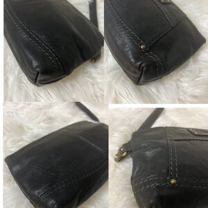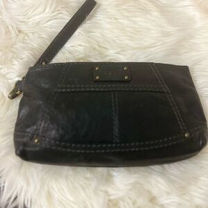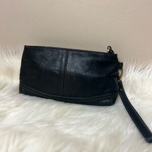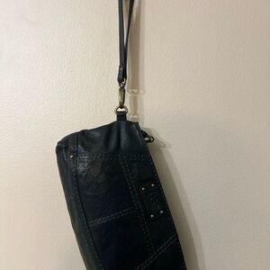 Elegant black leather clutch by UGG. Features a detachable wrist strap. Ideal for stylish outings.