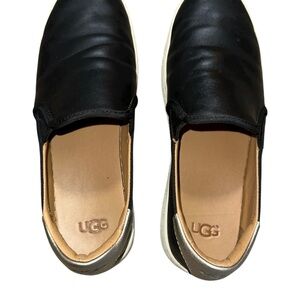 Comfortable black leather slip-ons by UGG. Perfect for casual wear.