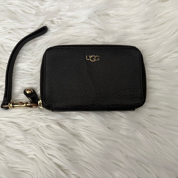 Elegant UGG wristlet in black leather. Features gold-tone logo and hardware. Includes a convenient wrist strap.
