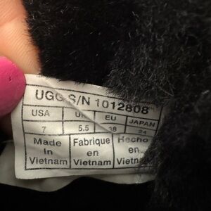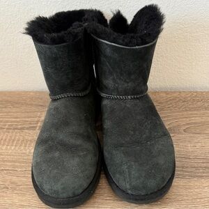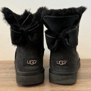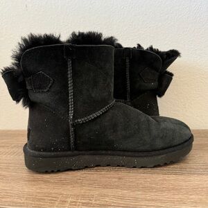 Super cute black UGG boots with large black bows on the back. Size 7M. These are in good condition except for light paint splatter on the interior of each boot (see last two pics). The sides that face out don't have it. Lots of life left!
