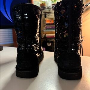 Stylish black sequin boots. Perfect for winter wear. Cozy and fashionable.