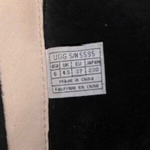 UGG Black Suede Mid-Calf Wedge Boots. Excellent condition. Bought around 2004 in Lord and Taylor (NYC). Maybe worn twice - please see photo of bottom soles, like new. Two -tone black boots with back zip. Buckle detail on front, rubber soles. Sheepskin lined so they are extra warm. Uppers and lining are leather. Some scuffing on side heels and some wear from storage. There is a storage bag included. Slight tear in seam on the bag (see last photo). Zippers are a little stiff from lack of use.