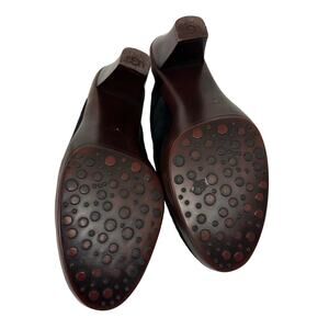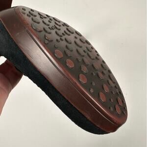 Black suede outter in good condition with silver tone buckle embellishments. Lined in soft and cozy sherpa that will keep the toes warm in the cooler weather. Perfect for Fall and Winter.