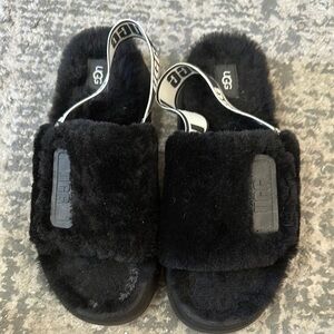 Step into comfort with UGG's black slippers, crafted from a soft, plush material for a cozy feel. The open-toe design and wide strap offer a relaxed fit, making them ideal for lounging indoors. Enjoy the simple elegance and warmth these slippers bring to your home footwear collection.