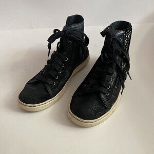 An edgy pair of sneakers from UGG! It comes with a lace up design. Some dirt and scratches on the upper and sole as seen in pictures. Measurements seen in picture. There are crystal accents and zipper on the side. The zipper doesn’t go all the way up.
