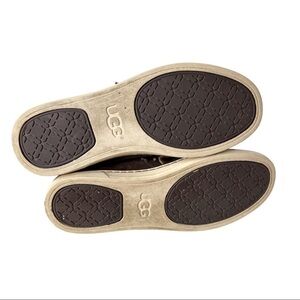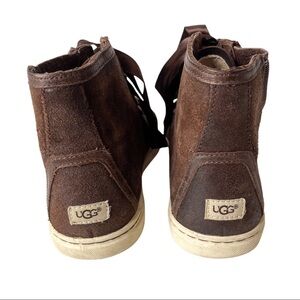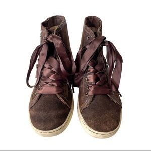 UGG Blaney High-Top Suede Sneaker in chocolate brown. Women's Size 5. 100% suede upper, crystal embellishment with zippers on sides, satin laces. Very good pre-owned condition, moderate signs of wear throughout.