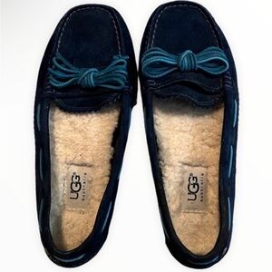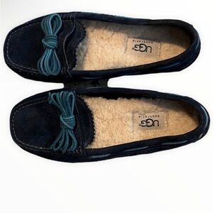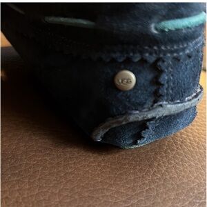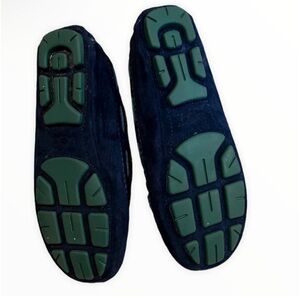 Square toe leather bow on top scalloped tongue leather rubber bottoms in great preloved condition no rips or tears lots of love left to give
