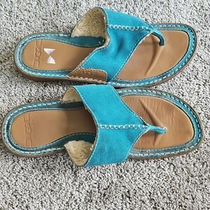 Experience the perfect blend of style and comfort with these UGG sandals, featuring a vibrant blue upper strap and a classic thong design. The sandals boast a flat sole and a natural-colored footbed, making them ideal for casual summer outings. Crafted with attention to detail, they offer a chic and effortless look for any warm-weather occasion.