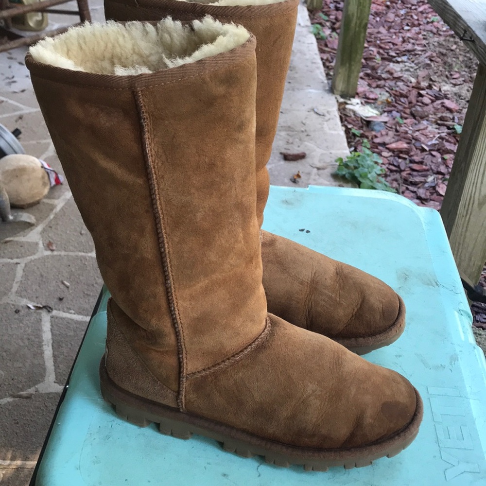Chestnut UGG size 8 but I’m an 8.5 and can wear them too. Would clean up nice with cleaner, just haven’t worn them in a long time. Shoot me an offer!