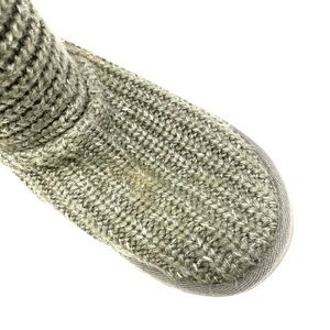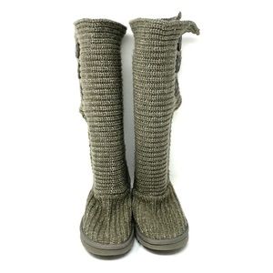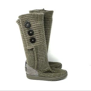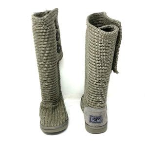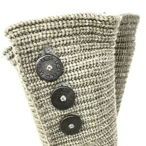 UGG gray Cardy button knit boots. Women’s size 7. Boot height about 16”. A few marks, spots and signs of wear (see photos). In good pre-owned condition. Box not included.