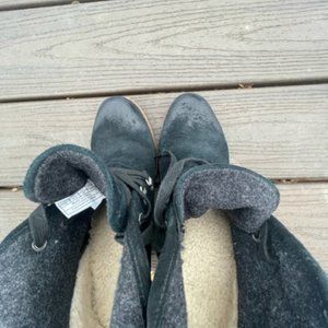 These ladies UGG boots are great for dress up or down. Sheepskin inner snuggly and warm, black, moderate heel, and a brushed distressed suede. They never saw snow or rain and are a classic tie up ankle boot. Original packaging available and ready to take on this winter in your closet.....