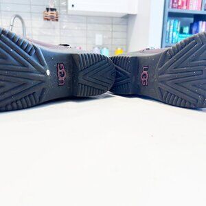 Part leather. dark red, barely worn with some light scuffing on the toe which can be buffed out with leather cleaner. Faux sheep wool inside, ideal for fall and winter.