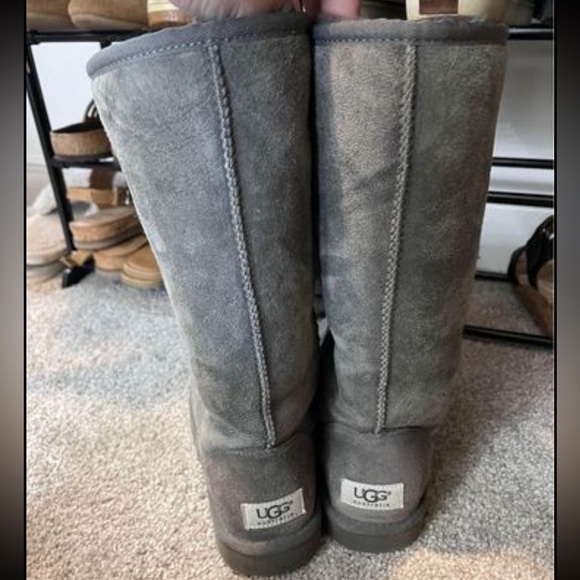 Good used condition tall grey UGG boots. Size 6. Slight staining on the right boot—could likely be scrubbed out.
