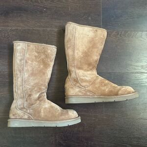 UGG Boots. These boots were pre-loved, good condition normal wear. Chocolate colored boots with cream fur and tan suede ties lace up the side.