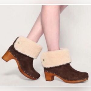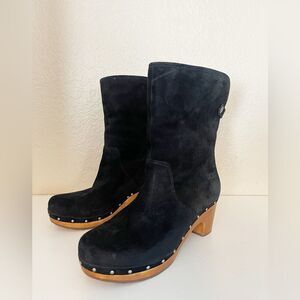 Clogs and boots combined for a cute look. Warm and cozy lined with Sherpa. Can be rolled down to show the lining. Black suede. 2.5” heel. Excellent used condition. Questions? Leave a comment below!