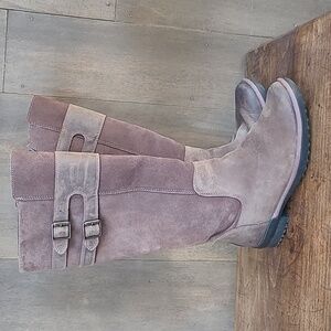 pre-loved, gently worn, good condition. Leather boot, side zip closure, double buckle calf accessory, UGGplush lining, UGGpure wool insole, spider rubber outsole for traction, best for rain or light snow, normal wear adds to patina