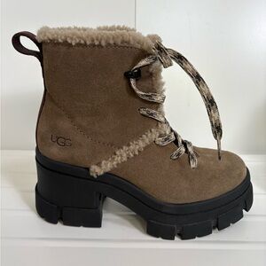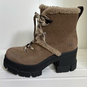 Stylish UGG boots with a chunky heel. Tan suede with genuine shearling lining. Water resistant. Ideal for winter wear. Excellent Preowned Condition, like new Worn once light scuff on one of the back heels