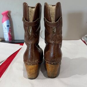 Elegant brown leather clog boots with a sturdy wooden heel. Perfect for casual wear.