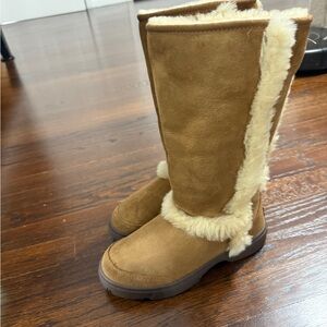 Boots- Chestnut ; slightly used but in Great Condition. Cozy brown suede boots with soft white fur trim. Ideal for winter warmth.