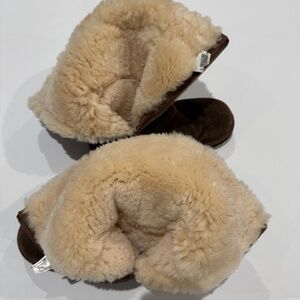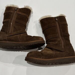 UGG, brown suede (Girls) boots with buckle detail and side zipper size 5. Inner calf side zipper, outer calf with 3 buckles, sherpa material within the inside of boot. Used in good condition.