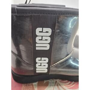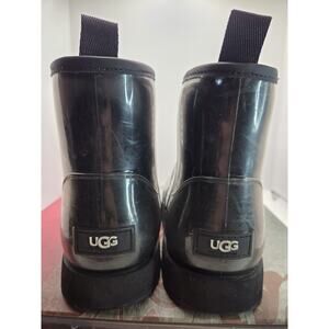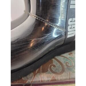 Definetly a little scuffed but plenty of good wear left! Super comfy. The UGG Classic Clear Mini Waterproof Ankle Boots in black are a stylish and practical choice for women's casual footwear. With a round toe shape, low heel, and ankle shaft style, these boots offer comfort and flexibility. Made with synthetic upper material and featuring a faux fur lining, these boots are both waterproof and warm, making them perfect for rainy days. The black color and logo accents add a touch of sophistication to this classic UGG Australia design. With a flat heel and rubber outsole, these boots provide both style and functionality for everyday wear.