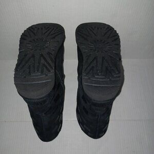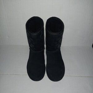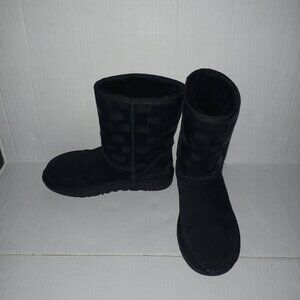 Size 7 Women's - Ugg Classic Short ll Boots with repeat UGG logo print on the upper area of boots in the color black the material is suede and the lining is Ugg plush wool. NOTE the boots have signs of wear on the front toe sole area as seen in the last photo otherwise in good preowned condition
