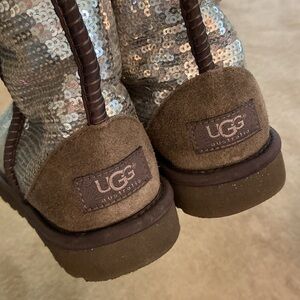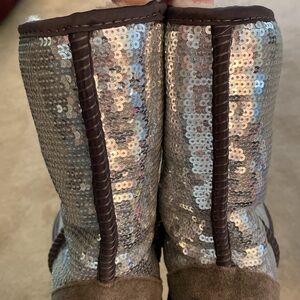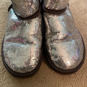 UGG CLASSIC SHORT SILVER SEQUIN BOOTS SIZE 7. THESE HAVE BEEN LIGHTLY WORN AND ARE CLEAN! NO ORIGINAL BOX. SUPER SHINY AND SPARKLY! SILVER GLITTER EMBEDDED IN THE RUBBER SOLES. PLEASE SEE AUTHENTIC HOLOGRAM ON TAG. VERR LIGHT CREASING AS SHOWN. NON SMOKING NON PET HOME.