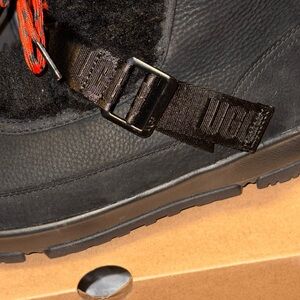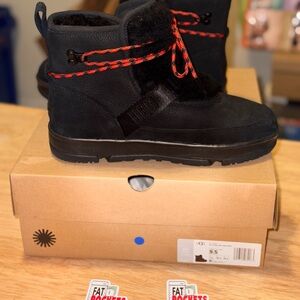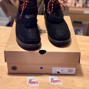These are UGG Classic Weather Hiker Boots for women in black, made of waterproof leather with fur trim accents. They feature a round toe, lace-up closure, ankle shaft style, and a low heel. The boots are lined with wool for comfort and warmth, suitable for casual wear in winter, fall, and spring. The UGG boots come in US size 9.5 (UK size 7.5) with a medium width.