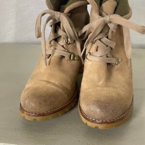 UGG Calynda Tan Suede Leather Heeled Booties Lace Up Sz 8 Shearling Lined Fall